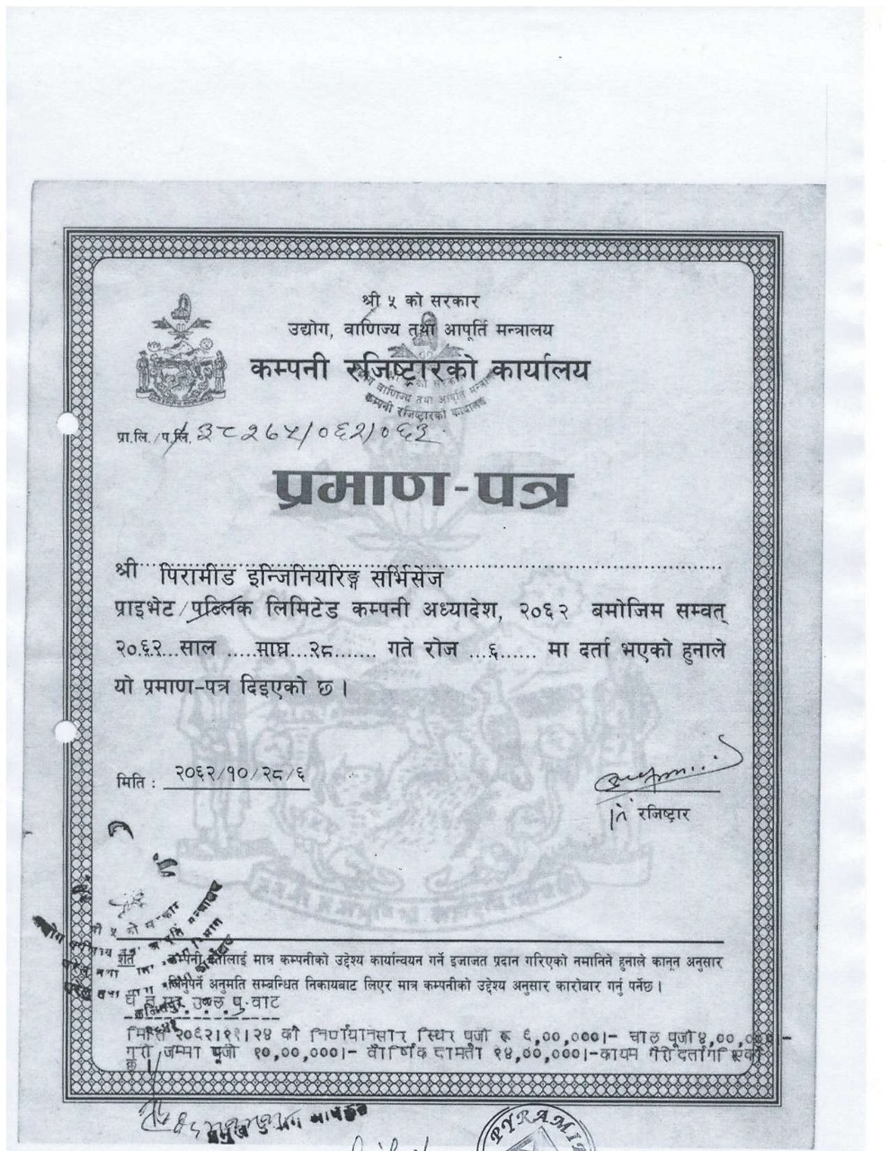Pyramid Engineering Services P. Ltd. (PES) is an organization aimed to support the infra structural development (Design and Construction of Building) with high level professional services. The core team is composed of personnel- experienced specifically in construction and engineering consulting services. All associative professional of this organization have efficient, effective and coherent experiences in technical, managerial knowledge of resolving problem.